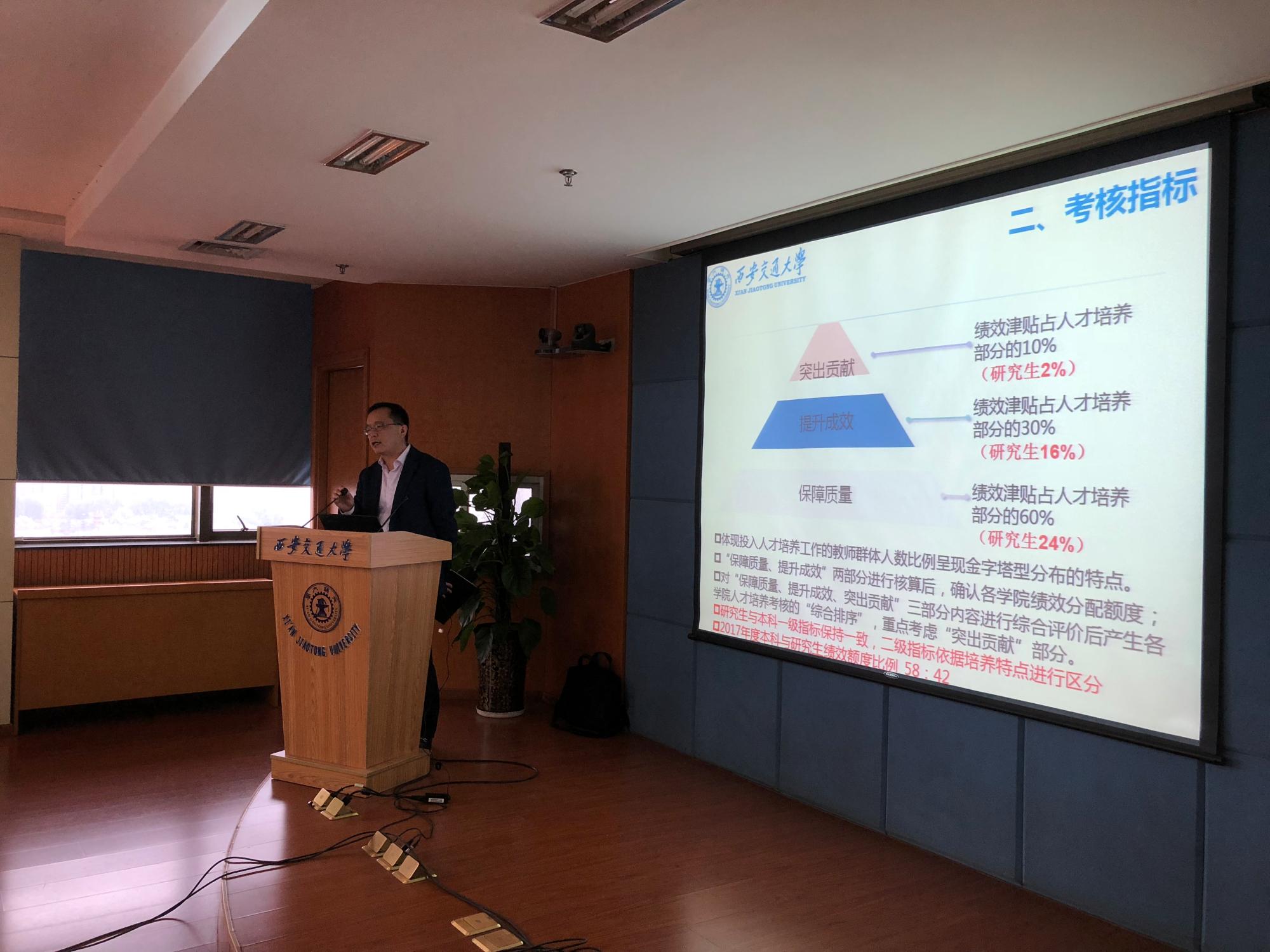 研究生院副院长龙建纲对2017年人才培养工作绩效考核情况进行了解读。龙院长指出,2017年人才培养工作绩效考核以全面落实学校“十三五规划”和“双一流建设方案”人才培养任务为重点,以贡献为导向,尊重人才培养的内在规律。绩效考核分配思想为“保障质量、提升成效、突出贡献”三部分,实施“优劳优酬、贡献奖励、负面惩罚”的绩效分配导向,从保障人才培养方案的实施质量到教育教学综合改革的创新成效,从招生、培养到毕业各个环节,系统设计分配指标,达到撬动第一课堂教学质量提升,人才培养全链条覆盖,突出贡献等预期效果。
