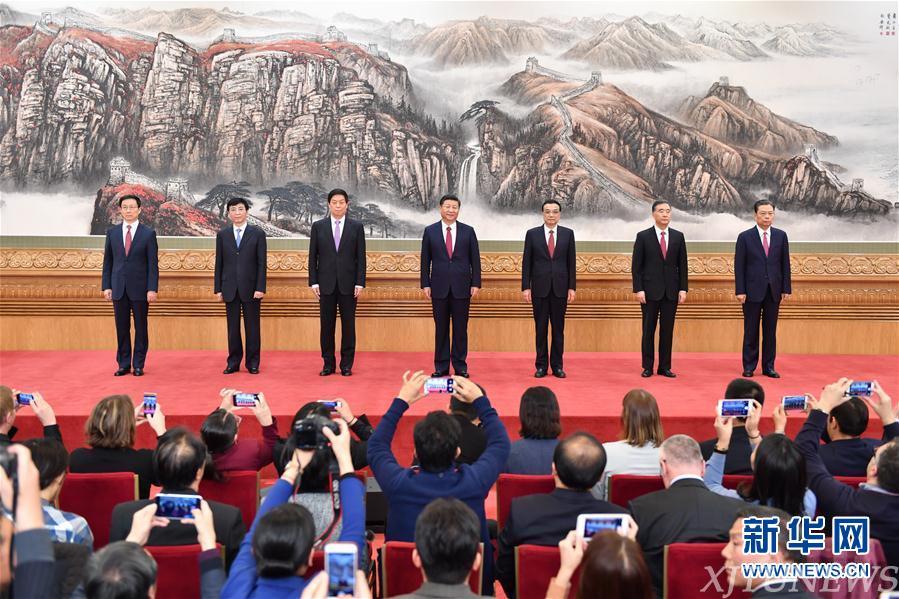 10月25日,刚刚在中共十九届一中全会上当选的中共中央总书记习近平和中央政治局常委李克强、栗战书、汪洋、王沪宁、赵乐际、韩正在北京人民大会堂同采访十九大的中外记者见面。新华社记者李涛 摄