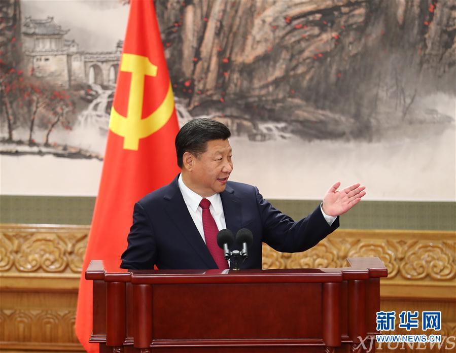 10月25日,刚刚在中共十九届一中全会上当选的中共中央总书记习近平和中央政治局常委李克强、栗战书、汪洋、王沪宁、赵乐际、韩正在北京人民大会堂同采访十九大的中外记者见面。这是习近平总书记发表讲话。新华社记者谢环驰 摄