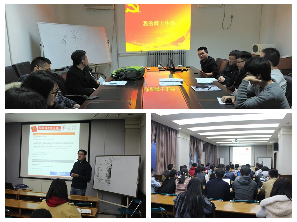 电信学院研究生辅导员李玉龙3月28日为学院研究生入党积极分子上了一堂生动的党课《从信仰谈入党动机》,并与研究生现场进行互动交流,他向入党积极分子讲述了中国共产党发展的历史,并介绍了近年中央提出的“八项规定”、“两学一做”等具体内容,他要求研究生端正入党动机,勤于思考,善于总结,勇于担当。